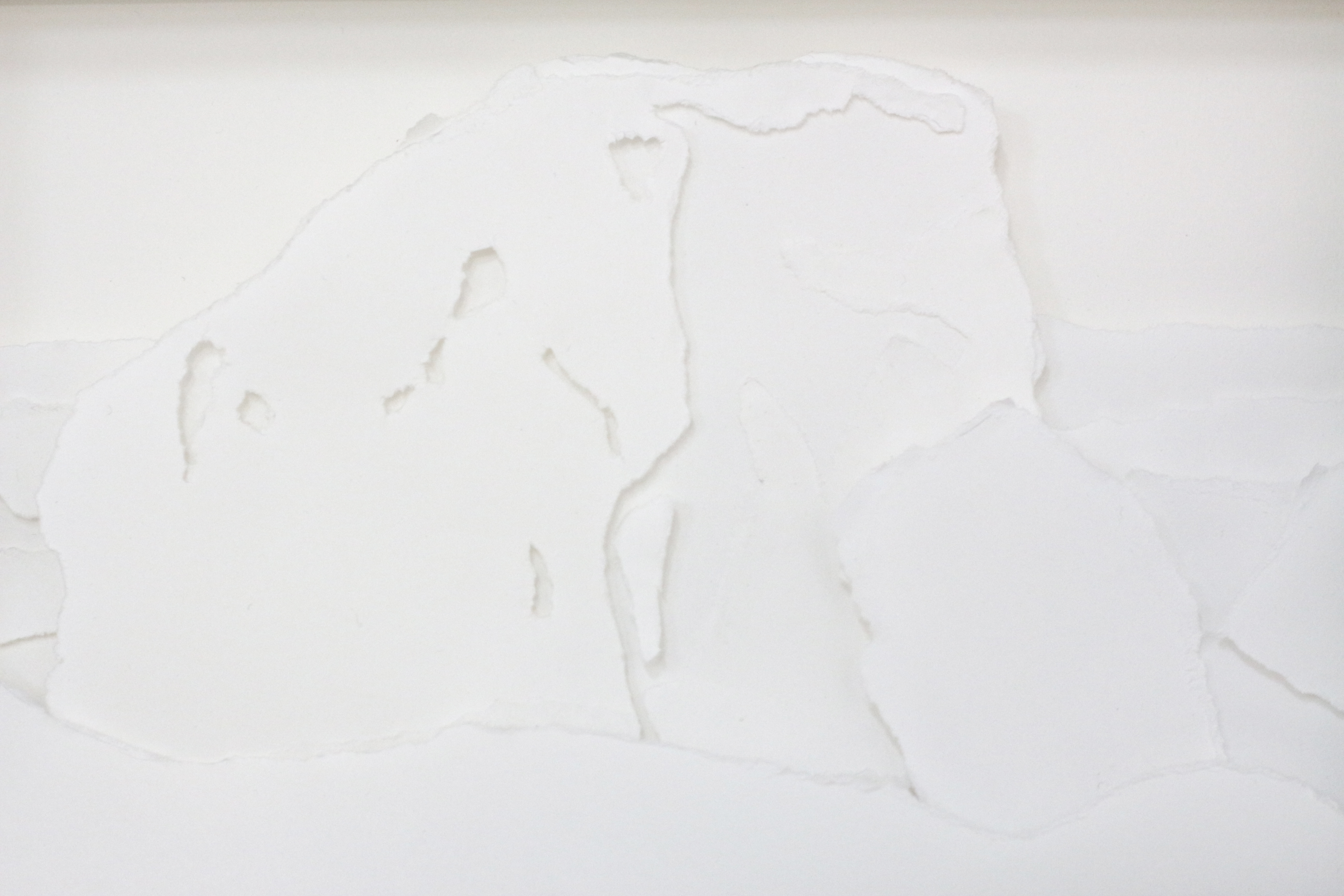 Une image latente semble apparaître dans le papier exposé à la lumière, processus comparable à celui de la révélation argentique. Je travaille le volume et l’éclairage conjointement, par strates, afin de sculpter l’image et sa profondeur de champ dans la matière.